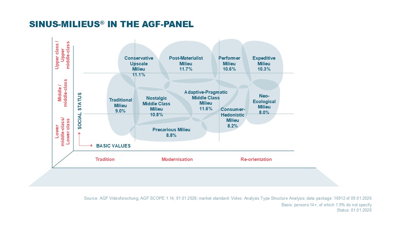 AGF also provides typologies to enable comprehensive target group analysis. Typologies are quite important for the marketing and communication industry because lifestyle differences are often a greater differentiation factor for consumer and brand preferences than purely socioeconomic conditions. AGF currently works with Sinus in this area.